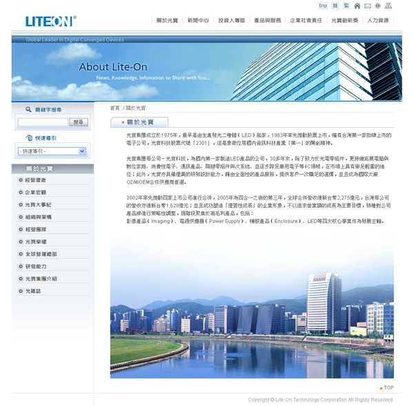 光寶集團(tuán)母公司-光寶科技,為國(guó)內(nèi)第一家製造LED產(chǎn)品的公司,30多年來(lái),除了致力於光電零組件,更持續(xù)拓展電腦與數(shù)位家庭、消費(fèi)性電子、通訊產(chǎn)品、關(guān)鍵零組件與次系統(tǒng)、並漸漸跨足車用電子等4C領(lǐng)域,在市場(chǎng)上具有舉足輕重的職位;別的,光寶亦具備優(yōu)異的研發(fā)設(shè)計(jì)本領(lǐng),藉由全面性的產(chǎn)品服務(wù),提供客戶一次購(gòu)足的選擇,並且成為國(guó)際大廠ODM/OEM相助供應(yīng)商首選。