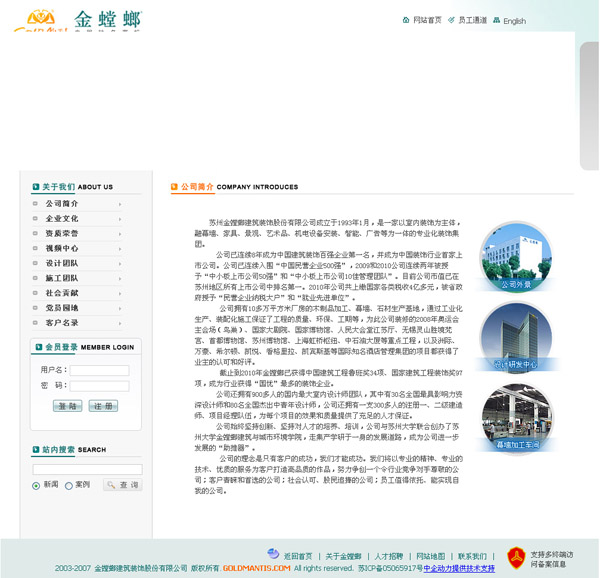 蘇州金螳螂構筑裝飾股份有限公司創(chuàng)建于1993年1月,是一家以室內裝飾為主體,融幕墻、家具、景觀、藝術品、機電裝備安裝、智能、廣告等為一體的專業(yè)扮裝飾團體。