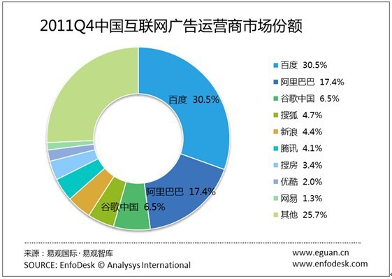 【TechWeb報(bào)道】一月三十一日信息息,EnfoDesk易觀智庫(kù)產(chǎn)業(yè)數(shù)據(jù)庫(kù)發(fā)布的《2011年第4季度中國(guó)網(wǎng)絡(luò)廣告市場(chǎng)季度監(jiān)測(cè)》數(shù)據(jù)顯示,百度、阿里巴巴、谷歌中國(guó)位居前三,百度占到中國(guó)互聯(lián)網(wǎng)廣告市場(chǎng)份額的百分之三十,阿里巴巴占到17.4%,谷歌中國(guó)占到6.5%。百度:30.5%,阿里巴巴:17.4% ,谷歌中國(guó):6.5%,新浪(不包含新浪樂(lè)居業(yè)務(wù))4.7%、搜狐:4.7%、騰訊4.1%、網(wǎng)易1.3%,搜房3.4%、優(yōu)酷2.0%,其他:25.7%