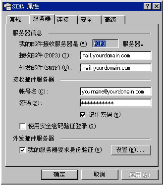 yourname@yourdomain.com;為了確保安全,密碼顯示為星號。如果您沒有輸入密碼或輸入密碼有誤,系統(tǒng)會在接收郵件時提示您輸入密碼。