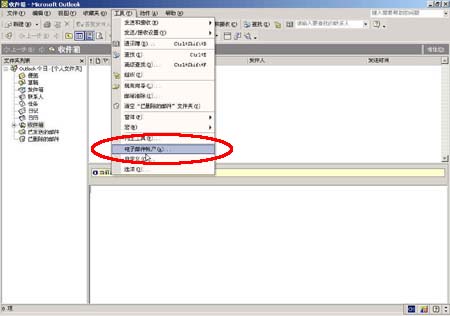 2.從菜單中選擇"工具/帳號(hào)"菜單項(xiàng),打開"電子郵件帳號(hào)"窗口;