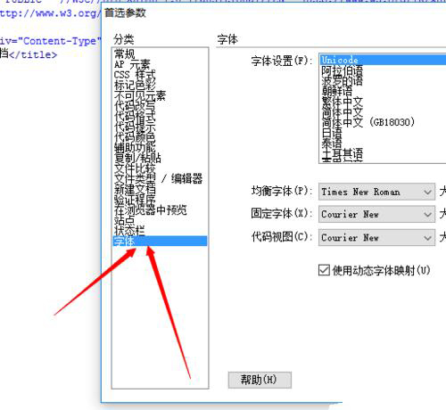 點擊“首選參數(shù)”之后,就會彈出一個小窗口,選擇其中的”字體“選項。