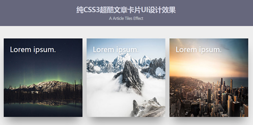 這是一款使用純CSS3制作的超酷文章卡片UI設(shè)計(jì)效果。該文章卡片帶有陰影效果,當(dāng)鼠標(biāo)滑過卡片時(shí),文章的描述信息會(huì)以滑動(dòng)動(dòng)畫的方式顯示在卡片中。